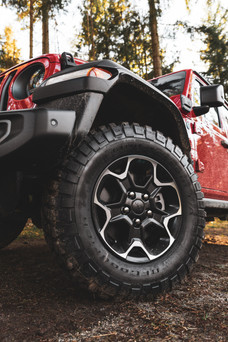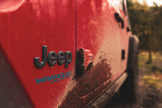 Sur le profil, on aperçoit la prise de recharge Type 2 parfaitement intégrée au design. Immanquables, les élargisseurs d'ailes, en plastique brut sur la finition Rubicon, tout comme les pneus à crampons BF Goodrich All-Terrain T/A nous prouvent que nous sommes bien là sur la finition destinée au franchissement.