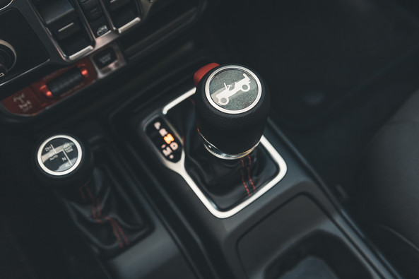 De base, le Wrangler est en propulsion, mais il est possible de choisir entre deux autres modes de traction : 4x4 auto, qui choisit lui-même où il doit transmettre la puissance et 4x4 50/50. Pour favoriser le franchissement, il est bien sûr possible de passer en boîte courte comme sur tout bon 4x4 qui se respecte !
